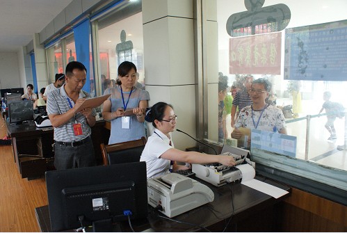 一等獎(jiǎng)獲得者顏小麗(前一)售票操作