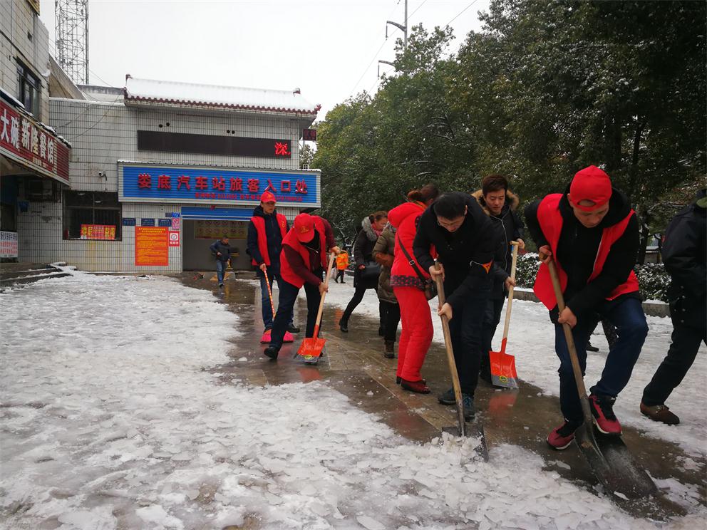 早上八點半,在車站生產(chǎn)副經(jīng)理付育平帶領(lǐng)下,辦公室、調(diào)度、稽查大隊、營收監(jiān)控隊、服務(wù)班、安保等部門近20多名志愿者拿著鏟子、鐵鍬和竹掃把等工具,對車站旅客入口處通道、車輛進站通道、車站站坪、短途通道、車輛出站通道等地的堅冰進行鏟除,寒風(fēng)凜冽,積雪厚重,冰塊堅硬,但我們的雷鋒志愿者們熱情高漲,大家發(fā)揚不怕若不怕累的精神,齊心協(xié)力,分工合作,揮鍬掄鎬,鉚足了勁,發(fā)起了挑戰(zhàn)嚴冰暴雪的攻堅戰(zhàn),在車站奏響了美妙的樂意,汗水濕透了背脊,手掌磨起了血泡,冰雪打濕了鞋襪,大家全然不顧,只看見一頂頂小紅帽在雪地上不停的運轉(zhuǎn),很多駕駛員和班線承包人紛紛加入鏟雪隊伍,婁星微馬隊的20多名隊員們在他們隊長的帶領(lǐng)下也來到車站幫著一起鏟雪除冰,他們橙色的微馬隊服也是一道道靚麗的風(fēng)景線。大家都有一個共同的名字——學(xué)雷鋒志愿者!他們的一言一行彰顯真情,贏得了過路市民的連聲稱贊!