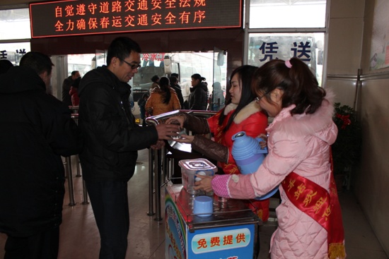 下圖為:“彩虹橋”優(yōu)質(zhì)服務(wù)班付麗艷給乘車的旅客遞上一杯熱茶,希望這杯小小的熱茶能夠為旅客驅(qū)趕冬日里的寒意,添絲溫暖。